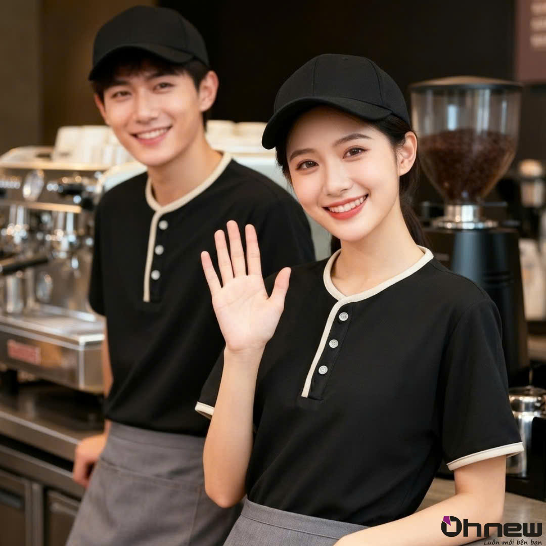 Chi tiết viền màu ở cổ, nẹp áo và tay áo giúp tổng thể có điểm nhấn rõ ràng nhưng không rối mắt, phù hợp với những mô hình cần hình ảnh chỉn chu như quán café, tiệm bánh, nhà hàng hoặc cửa hàng dịch vụ.